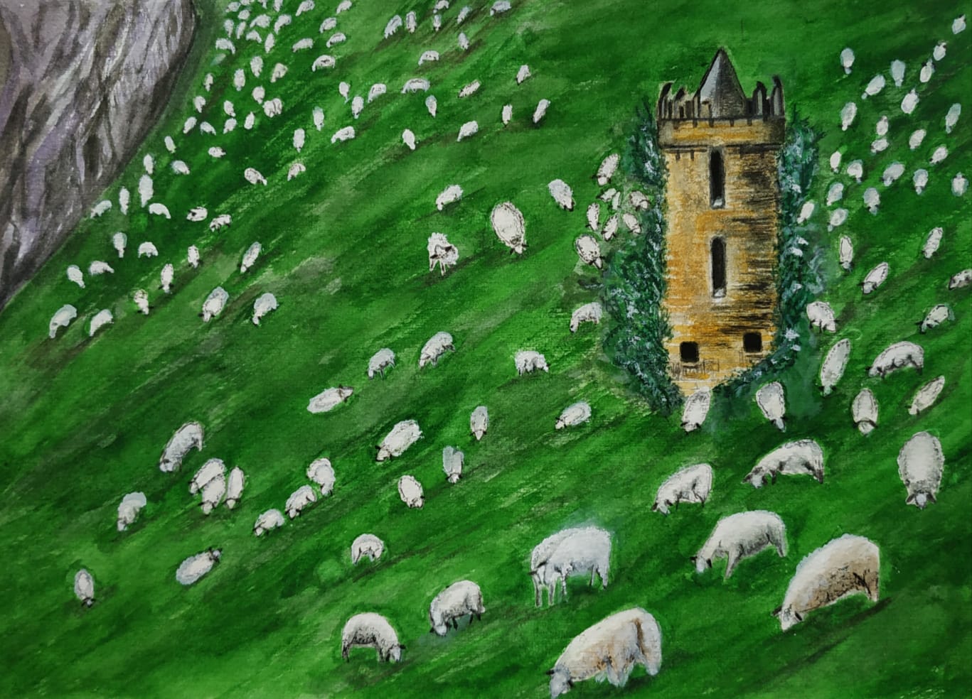 Decora tus espacios con hermosos cuadros de paisajes de arte bucólico. Encuentra la colección de cuadros originales de paisajes pintados en acuarela de castillos y ovejas.